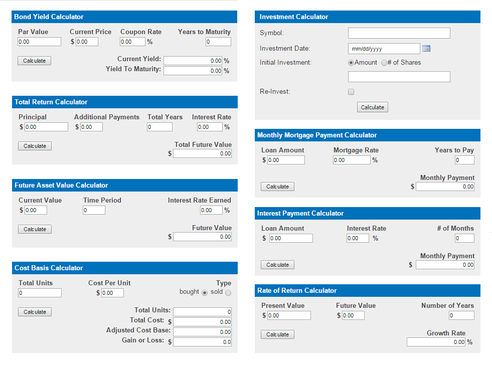 Some current examples include: Bond Yield, Cost Basis, Future Asset Value, Loan Payment, Investment Calculator, Monthly Mortgage Payment, Present Asset Value, Rate of Return, Total Return, Currency Converter.