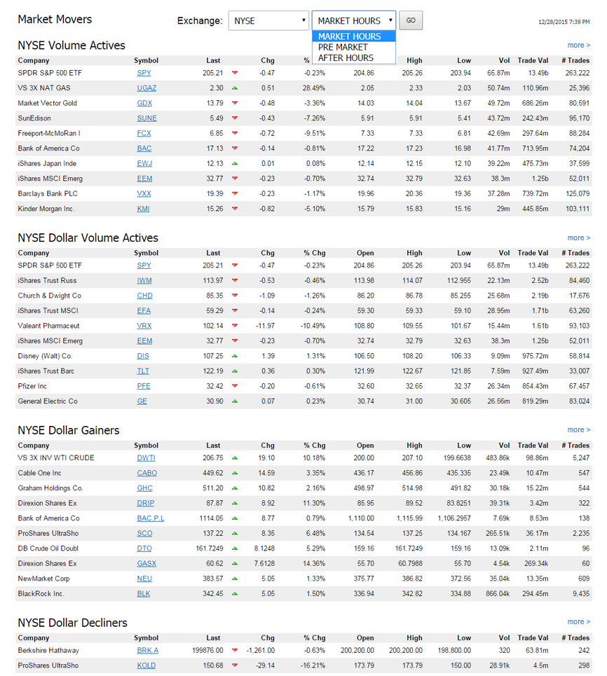 The list of Market Movers is available for all US Exchanges, Canadian Exchanges and the London Stock Exchange (LSE).
