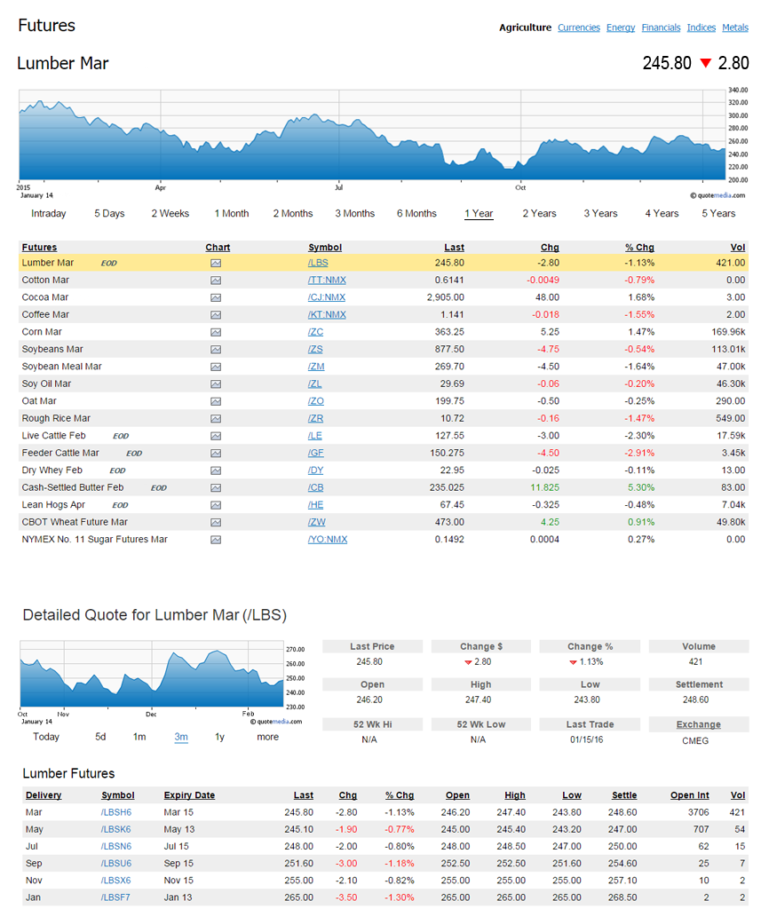 QuoteMedia's Futures and Commodities coverage spans all North American exchanges. QuoteMedia has complete futures coverage, including last sale price and volume, bid and bid size, ask and ask size, open, high, low and closing price and history.
